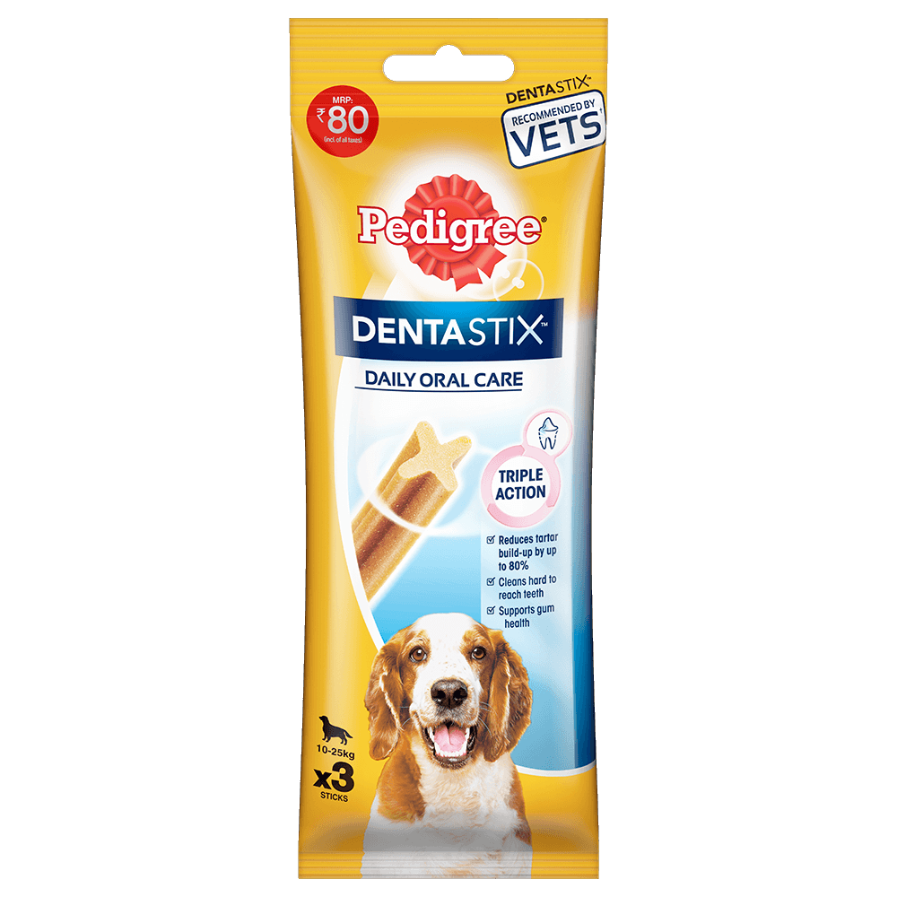 Did you know that 4 out of 5 dogs over the age of three suffer from gum disease? PEDIGREE DENTASTIX is an effective daily oral care dog chew treat that is scientifically proven to help reduce tartar build-up in your dog’s teeth by up to 80%. PEDIGREE DENTASTIX is available for adult dogs of all breeds and sizes : Small, Medium & Large