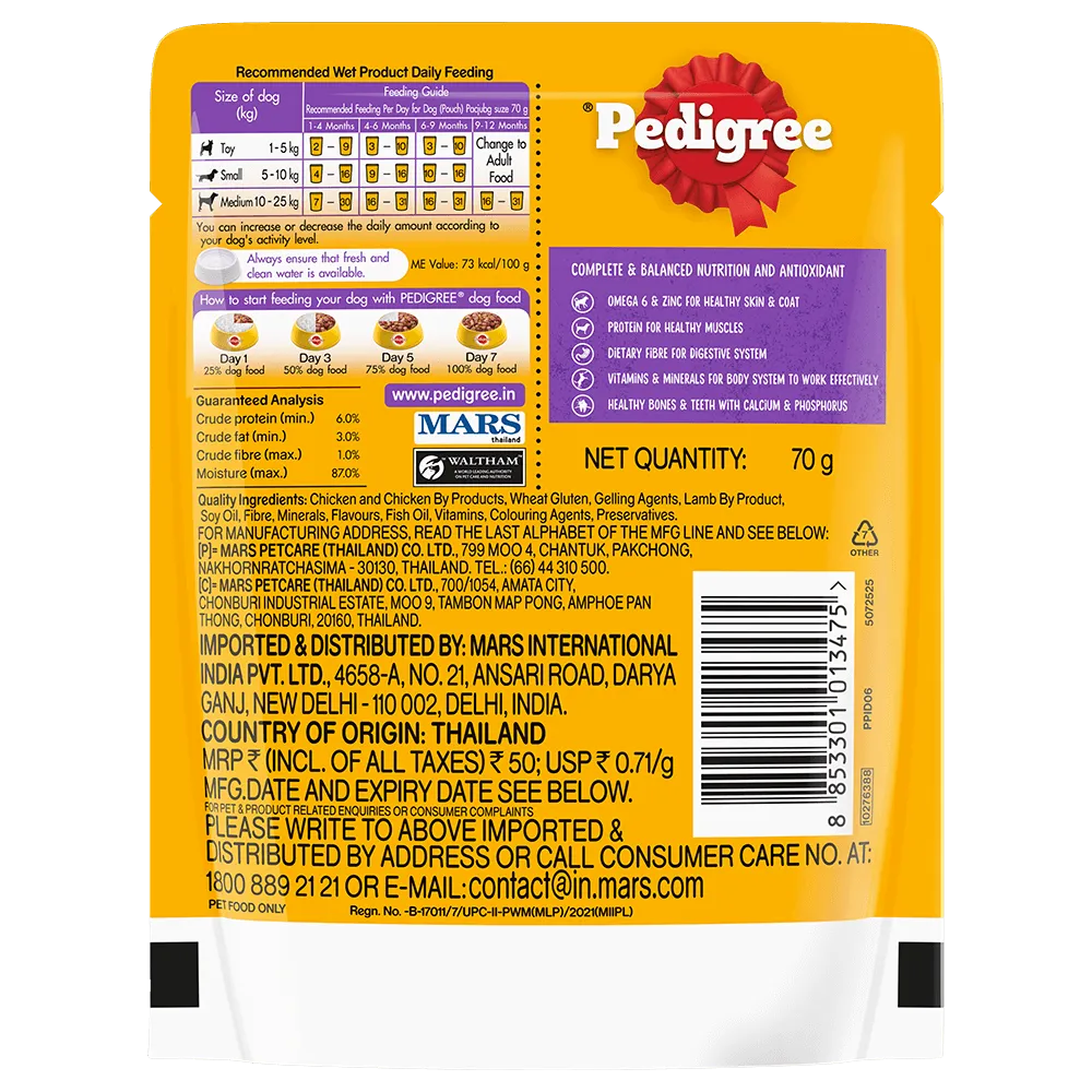 PEDIGREE Lamb Flavour Chunks in Gravy food provides complete and balanced nutrition to your puppy. Easy to feed, it consists real meat with the essential nutrition required to keep your pet happy and healthy. You can also add PEDIGREE Lamb Flavour Chunks in Gravy to regular dry pet food or home cooked food to serve up a meal that your puppy will love, or you can even give it as a standalone gravylicious meal! The newer Lamb flavour offers a greater variety of flavour, texture, and taste. Its rich aroma and delicious flavour are perfect for fussy eaters. In addition, turning 25% of your pooch’s meals as gravy, which has a high moisture content in it, may reduce the risk of stones.