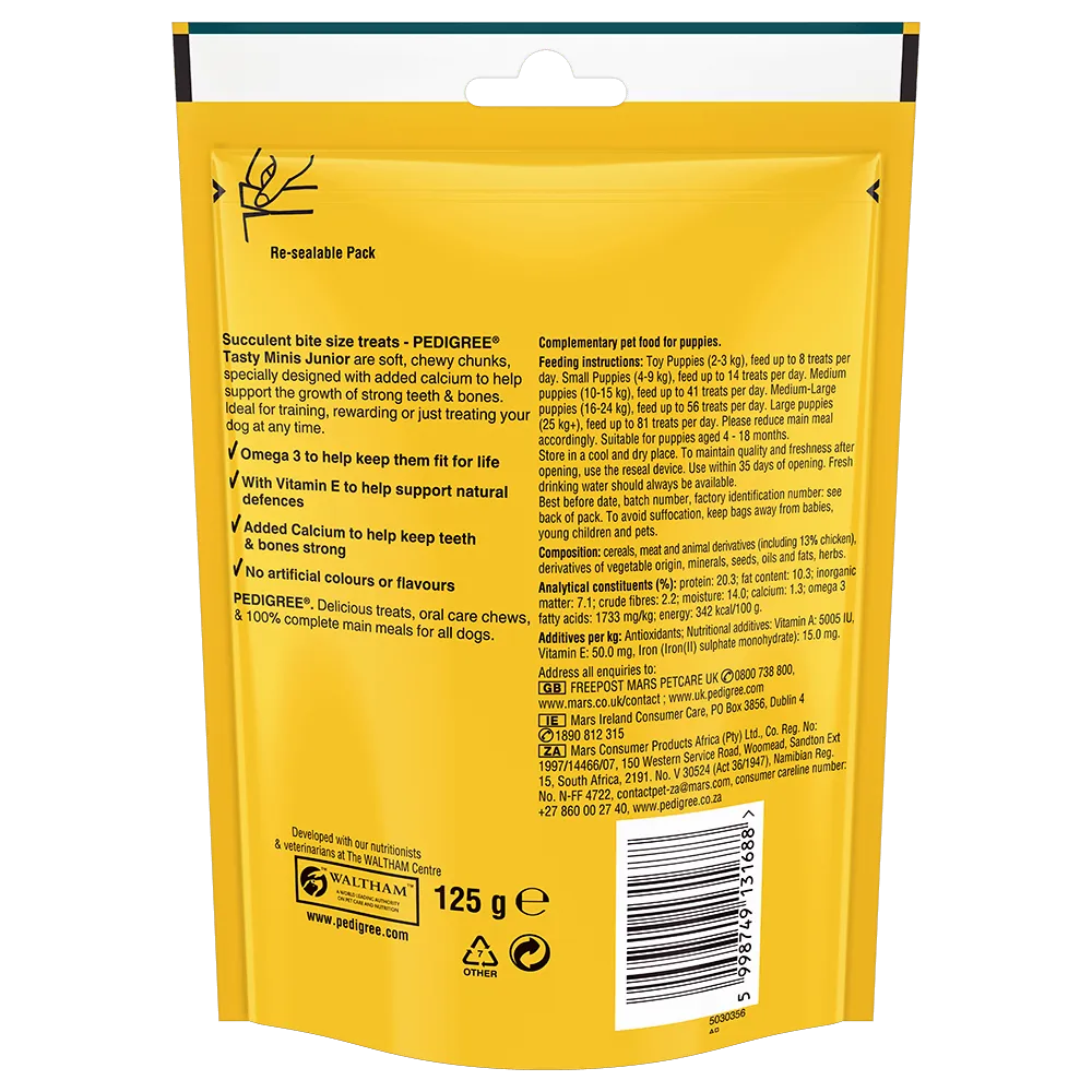 PEDIGREE TASTY MINIS are succulent, bite-sized treats for adult dogs. They are soft, chewy chunks that are less than 12 kcal per treat and contains Omega 3 to help with fitness, Vitamin E to support natural defences and minerals like calcium to help strengthen bones. PEDIGREE TASTY MINIS are also free from artificial colours and flavours. Train, reward or treat you furry friend any time!